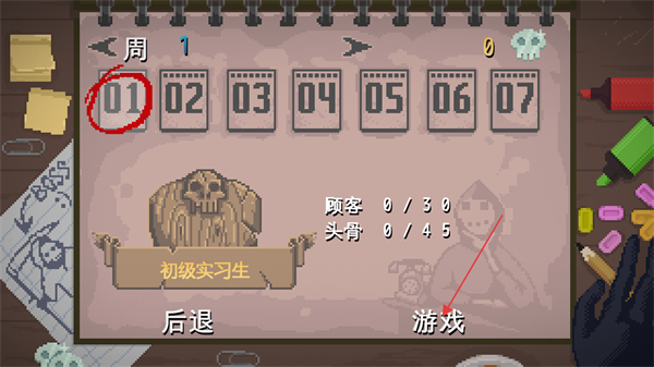 1、这是游戏的周1关卡界面,当前显示身份为初级实习生,需达成顾客0/30、头骨0/45的目标,点击界面下方的游戏按钮,即可进入关卡开始操作。