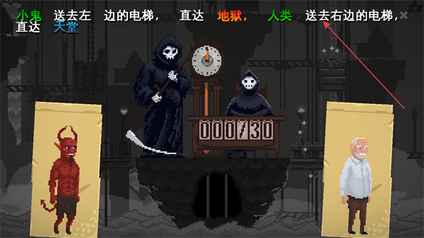 2、进入关卡后,界面会显示分配规则,即小鬼送去左边的电梯直达天堂,人类送去右边的电梯直达地狱,需按此规则分配角色。