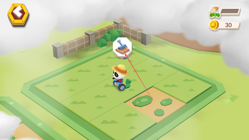 2、操控熊猫角色驾驶耕地车在农田区域移动,完成耕地操作。