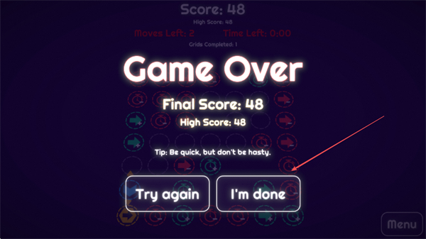 4、若游戏结束,可选择Tryagain重新开始,或选择I’mdone结束游戏,不断挑战高分。