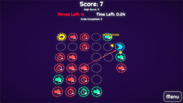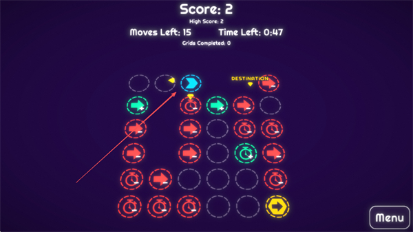 1、操控带有箭头的蓝色方块,根据箭头方向移动,目标是到达标有DESTINATION的位置。