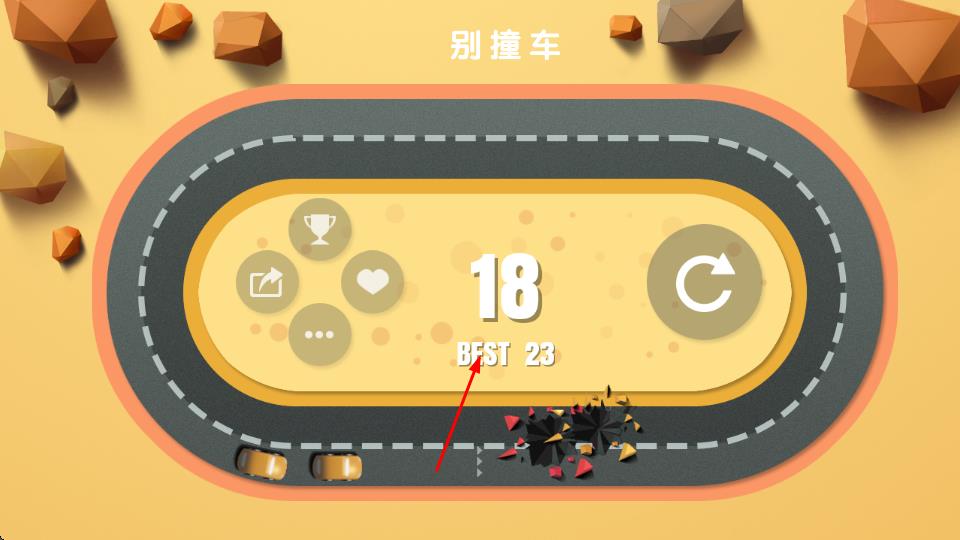 4、若发生撞车,游戏结束,会展示本次得分以及历史最佳得分,可选择重新开始游戏挑战更高分数。