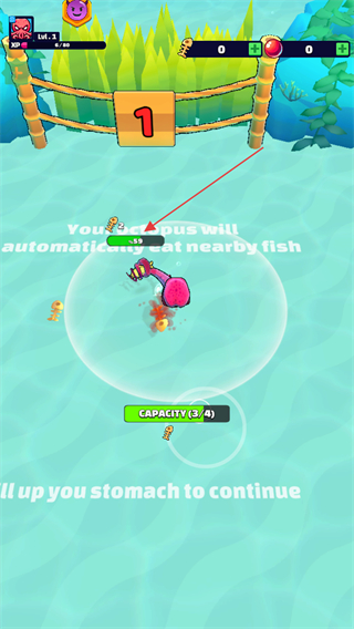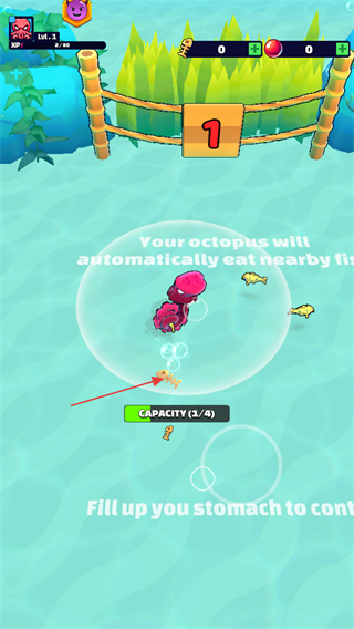 2、控制章鱼让其他小鱼进入触手的范围圈内进行吞噬,被抓到的小鱼上方会显示吞噬后获得的鱼骨数量与血量。