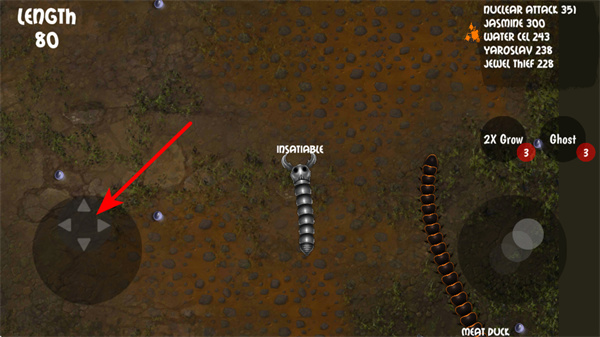 1、操控你的蜈蚣时,通过左下角的方向按键控制移动方向,以此灵活穿梭场景,避免碰撞或追赶目标。
