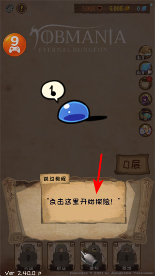 1、进入游戏界面后,点击提示区域的点击这里开始探险,这是开启地牢探险的关键操作,准确点击才能进入关卡。