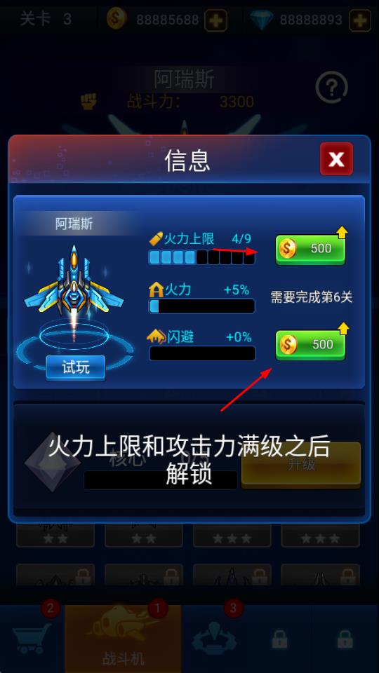 1、可对战斗机进行升级,花费金币提升火力上限、火力、闪避等属性。