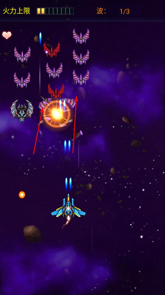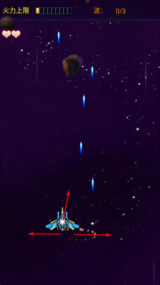2、在太空场景中,操控战斗机左右、上下移动,躲避陨石等障碍物。