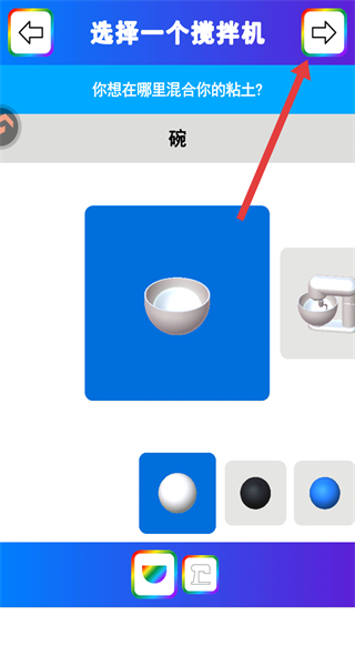 2、在进入到创建页面时,可以挑选搅拌器材,选择好后点击右上角按钮进入下一步。