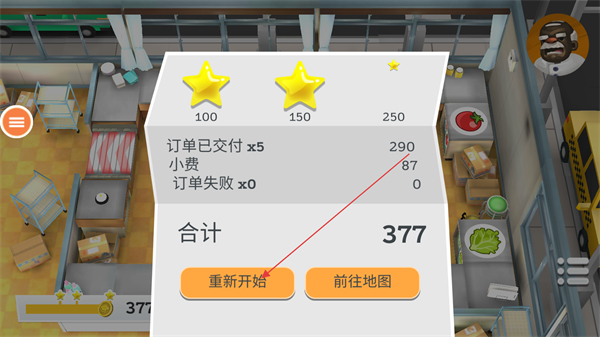 4、完成订单后可获得星星评价和金币奖励,点击前往地图解锁新关卡,继续挑战。