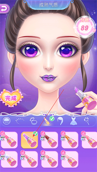 2、选择唇妆工具涂抹口红,完善妆容细节,增加分数。