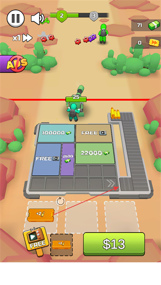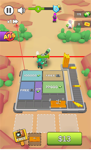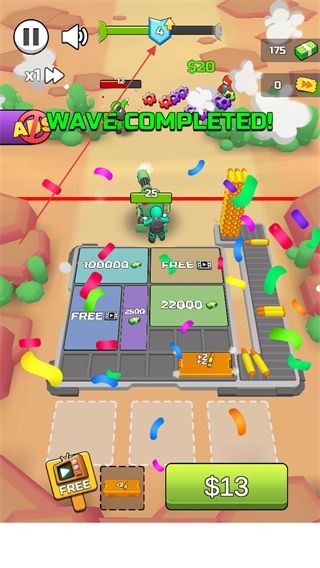 2、花费金币如$13在棋盘上放置更多子弹生成器,增加子弹产量,强化火力。