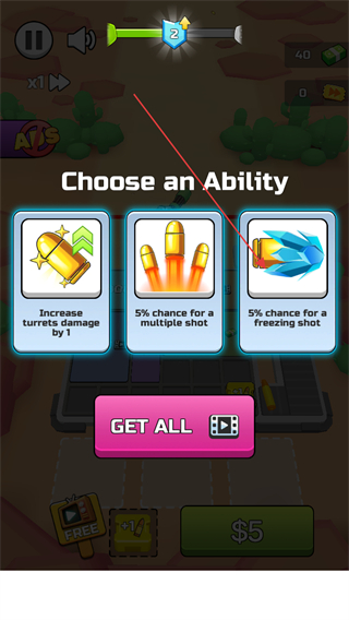 1、升级时选择能力如增加炮塔范围、多重射击、冰冻射击,提升炮台战斗效果。
