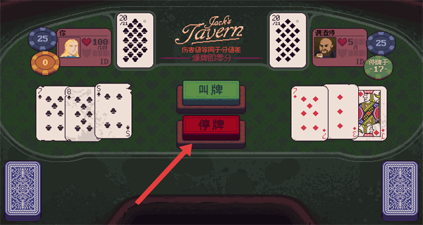 4、当牌面分数达到合适数值时,点击“停牌”按钮结束抽牌,与对手比拼牌面分数,分数差距将转化为伤害,击败对手即可推进游戏。