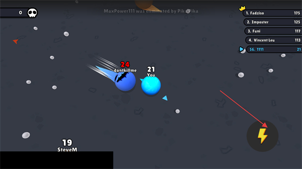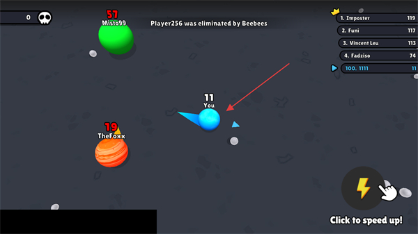 3、在地图内不断吞噬散落的小球进行体型的增长,注意躲避其他大球。