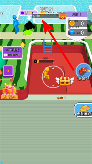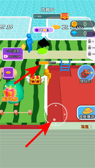 2、操控黄色小人角色进行挖矿,挖掘过程中可提升坑洞深度。