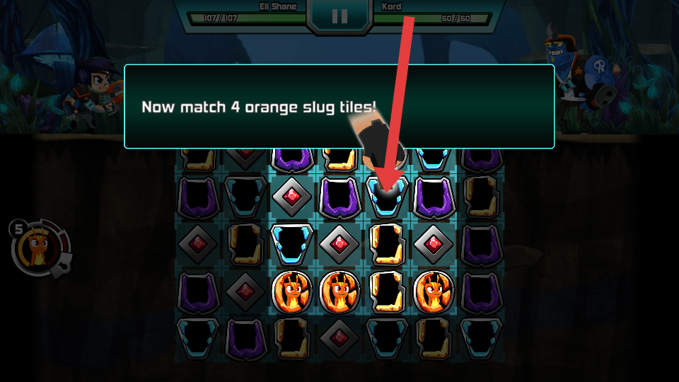 1、在游戏的消除环节,按照提示匹配4个橙色的slug瓷砖,这是触发攻击或获取资源的关键操作。