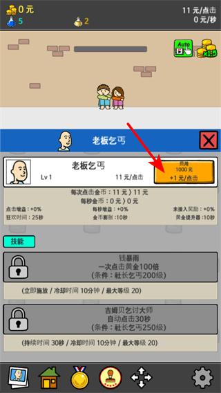 2、在老板乞丐界面,点击机票1000元+1元/点击的黄色按钮,可提升点击收益,助力快速积累游戏资源,推动角色成长。