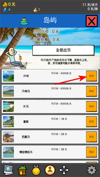 4、在岛屿界面,点击购买按钮可购置冲绳等岛屿,这些岛屿资产价值会上升,为玩家带来持续收益,是重要操作。