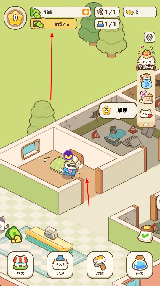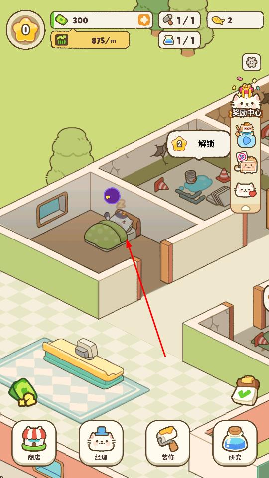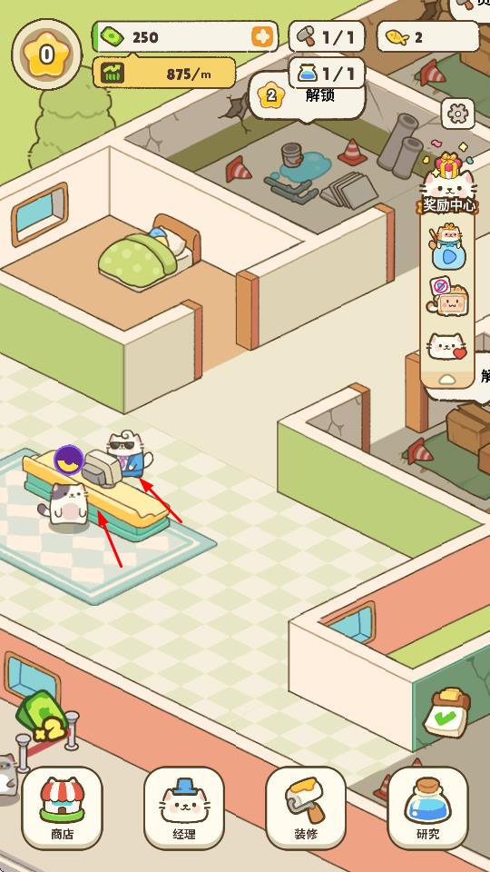 3、消耗资源解锁客房区域,为猫咪顾客提供休息空间,同时可通过解锁提示拓展酒店的可使用区域。