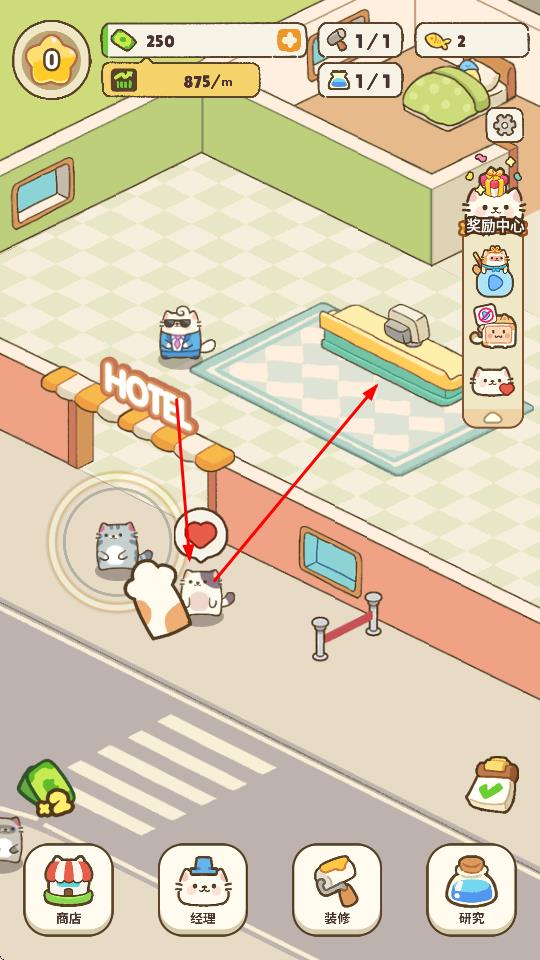 1、进入游戏界面后,在酒店门口吸引猫咪顾客,这是开启酒店经营的关键操作,为酒店带来客源。