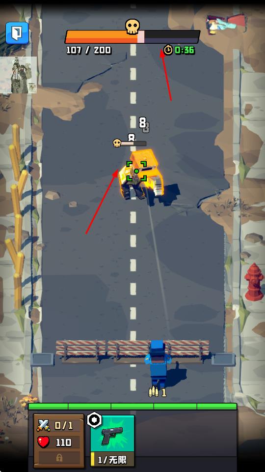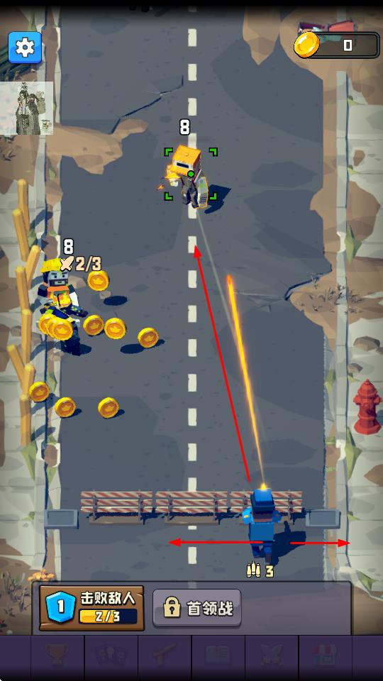 1、操控角色在道路场景中左右移动,躲避障碍物,同时瞄准敌人进行射击。