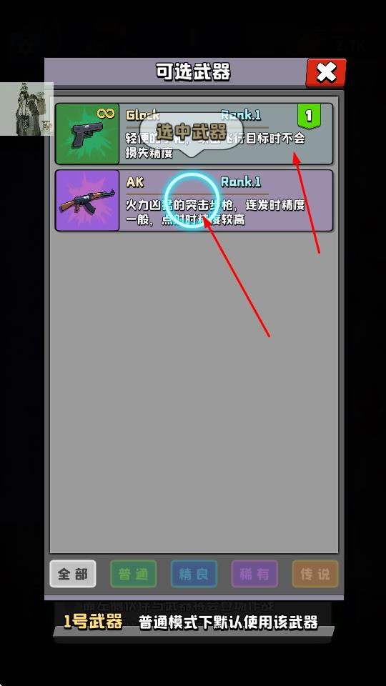 3、在可选武器界面,可选择不同武器,不同武器有不同特点。