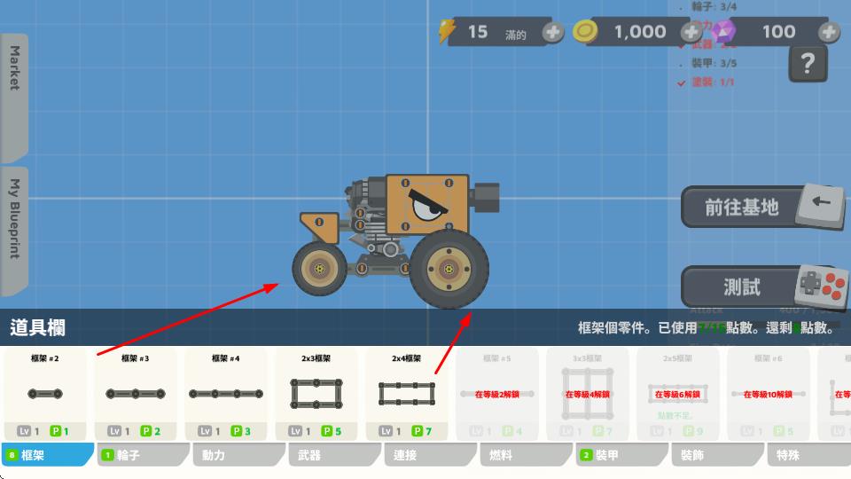1、在建造界面,选用框架、轮子等部件组装机械车辆,打造专属战斗载具,为后续战斗做准备。
