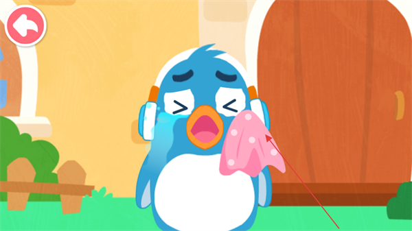 2企鹅宝宝因为和妹妹相处时说了不好的话而伤心,点击拖动毛巾帮他擦干眼泪。
