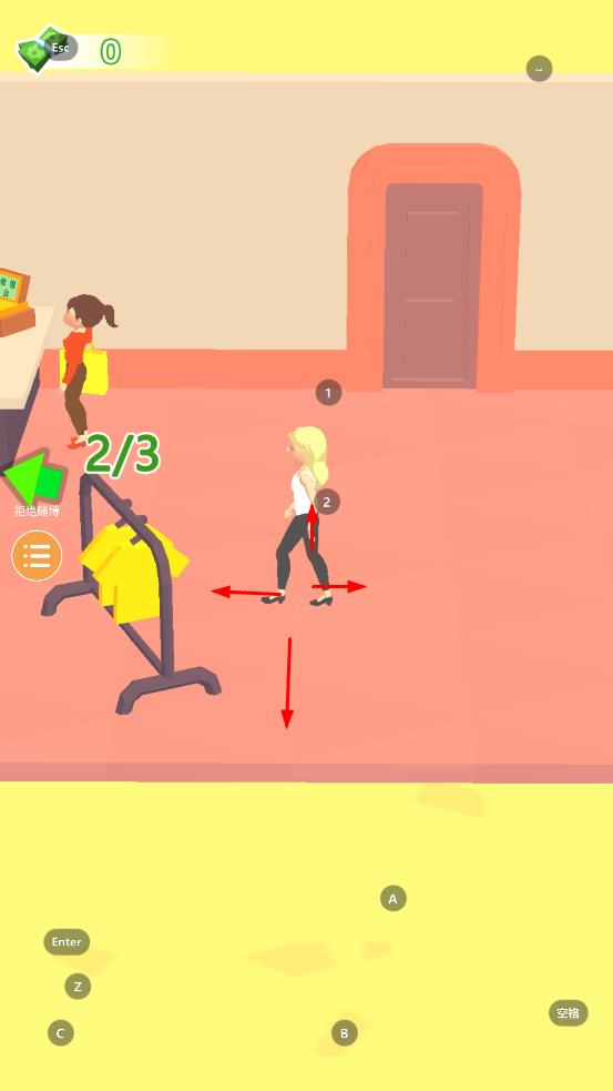 1、操控角色在店铺内移动,前往衣架区域收集黄色衣物,留意界面2/3等收集进度,开启购物流程。