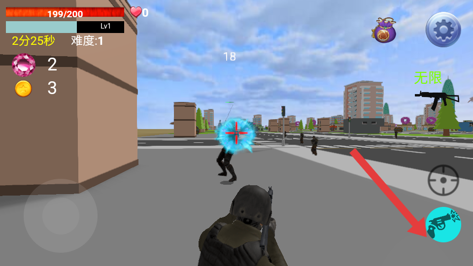 3、在不同场景中,持续点击手枪图标,对出现的敌人进行连续射击,积累击杀数,获取宝石金币奖励。
