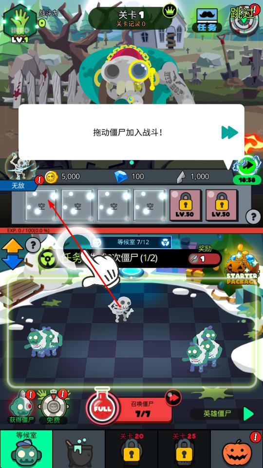3、将僵尸拖动到战斗区域,让其加入战斗,参与对敌人的攻击。