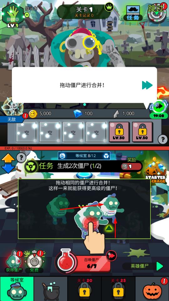 2、拖动相同的僵尸进行合并,能获得更高级的僵尸,提升僵尸的等级与能力。