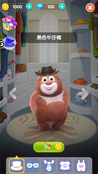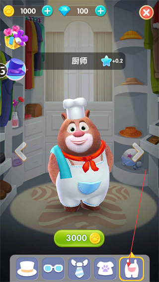 1、进入游戏后,在熊大的温馨小屋中,可以和熊大进行互动或是点击左下角的试衣间按钮进行换装。