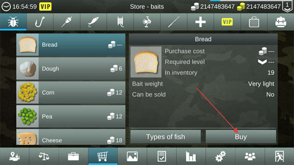 4、在游戏商城界面选中Bread饵料,点击Buy可购买该饵料,用于后续垂钓吸引鱼类。