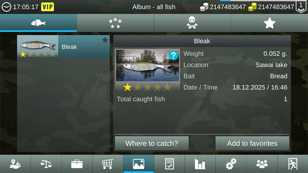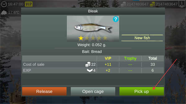 1、钓到Bleak后查看其重量及Bread饵料信息,点击Pickup即可获取该鱼、对应EXP与收益。