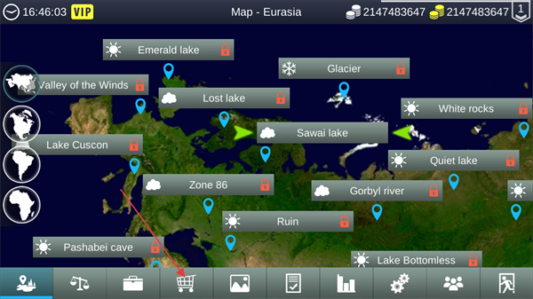 3、在Map-Eurasia界面选择Sawailake等区域,点击下方购物车图标选项,进入游戏商城进行购物。
