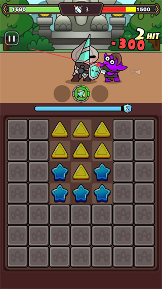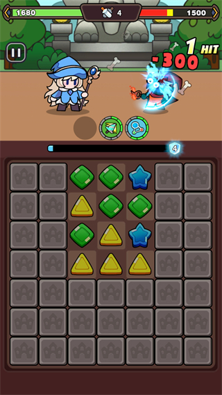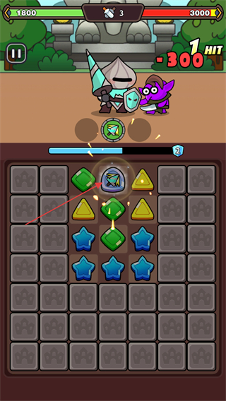 1、消除棋盘上的元素,触发攻击对敌方造成1HIT-300伤害,推进战斗进程。