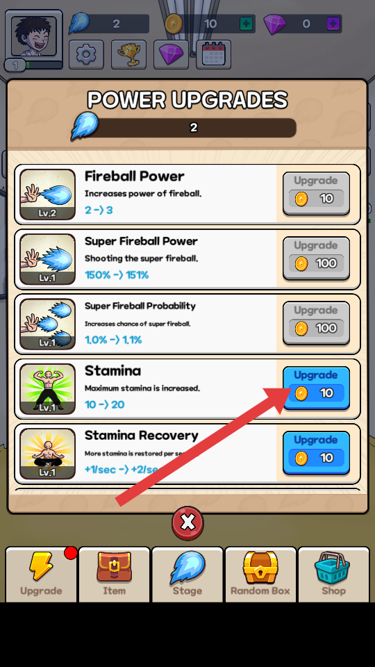 2、进入POWER UPGRADES升级界面后,花费10金币可将最大耐力从10提升至20,提升角色的持续的战斗的能力。