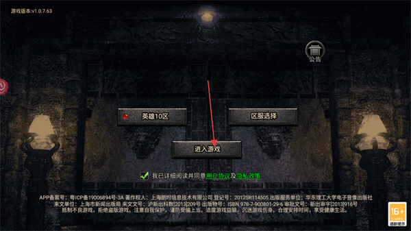 1、在游戏登录界面,勾选我已详细阅读并同意用户协议及隐私政策后,选定英雄10区点击进入游戏按钮进入游戏。