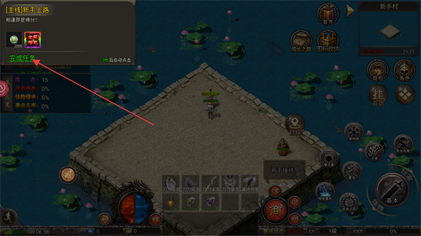 3、处于新手村场景时,接取主线新手上路任务,待倒计时结束后点击完成任务按钮领取对应的任务奖励。