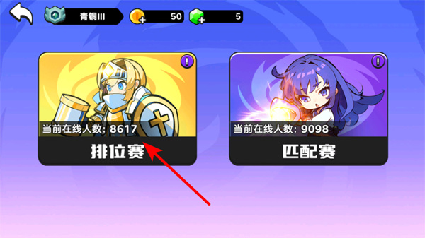 1、选择对战类型,类型选择是开启竞技的关键操作,选择后可进入排位赛或匹配赛,开启卡牌对战之旅。