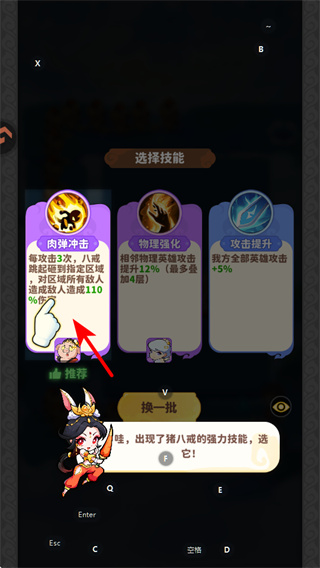 3、在技能选择界面中点击肉弹冲击技能选项,该技能会为对应角色附加攻击变八次,八戒进入该区域所有人造成110%伤害的增益效果。