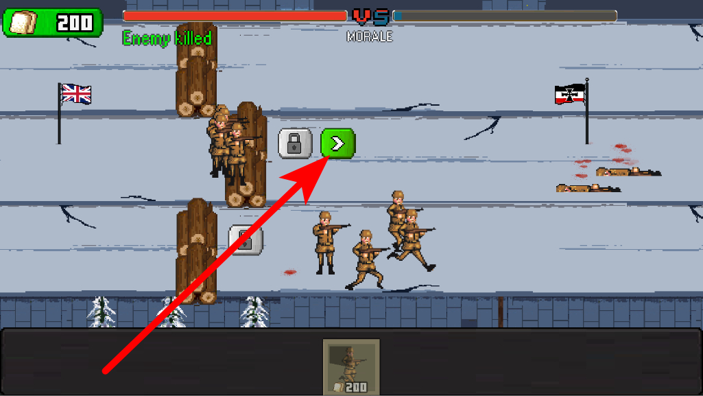 2、点击绿色箭头翻过障碍物,当部队遇到障碍物阻挡时,点击绿色箭头按钮,部队就能翻过障碍物,继续向敌方阵地推进,开展进攻。