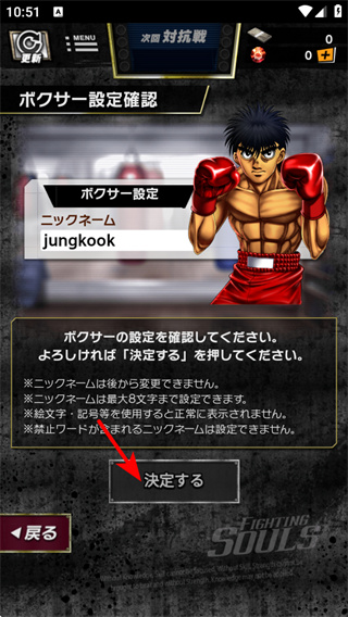 3、在拳击手设定确认界面,检查昵称等信息无误后,点击确定,完成拳击手的创建,正式进入游戏世界。