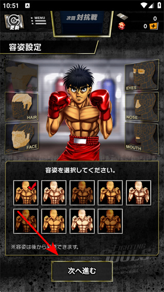 2、在角色容貌设定界面,选择心仪的发型、脸型等容貌选项,打造专属拳击手形象,完成后点击,推进流程。