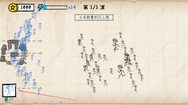 1、点击左下角士兵图标,派遣蓝色士兵出战,注意士兵数量上限,合理派遣。