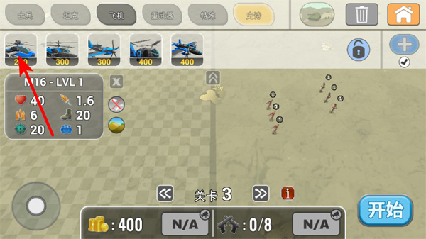 1、在部队选择界面,点击M16直升机可将其编入己方部队,该直升机具备空中优势,能对地面敌方单位发起有效打击。