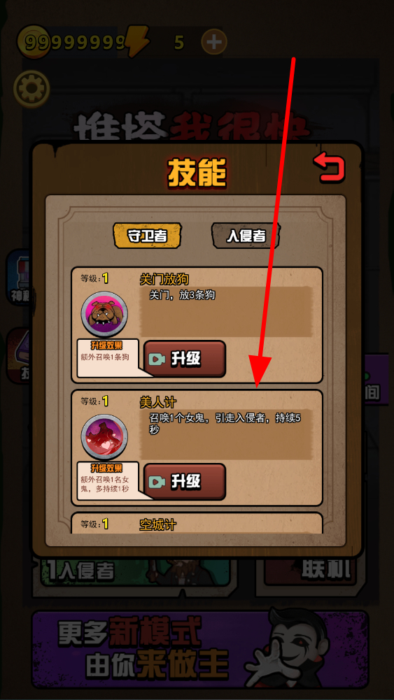 2、技能界面对守卫者技能升级,关门放狗升级后能额外召唤1条狗,美人计升级后可多召唤1名女鬼且持续时间延长1秒,提升技能增强自身战力。