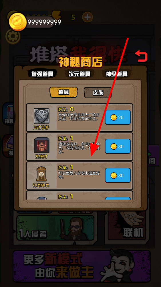 1、进入神秘商店,可花费金币购买各类道具,像自动维修能修复房间大门耐久度,发横财在炮塔攻击时自动产金币等道具,购置道具助力守卫。