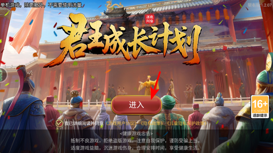 1、在游戏启动界面,勾选协议后点击进入按钮可开启君王成长的玩法,这是进入朝政管理基础操作,通过早朝、推进国家建设。
